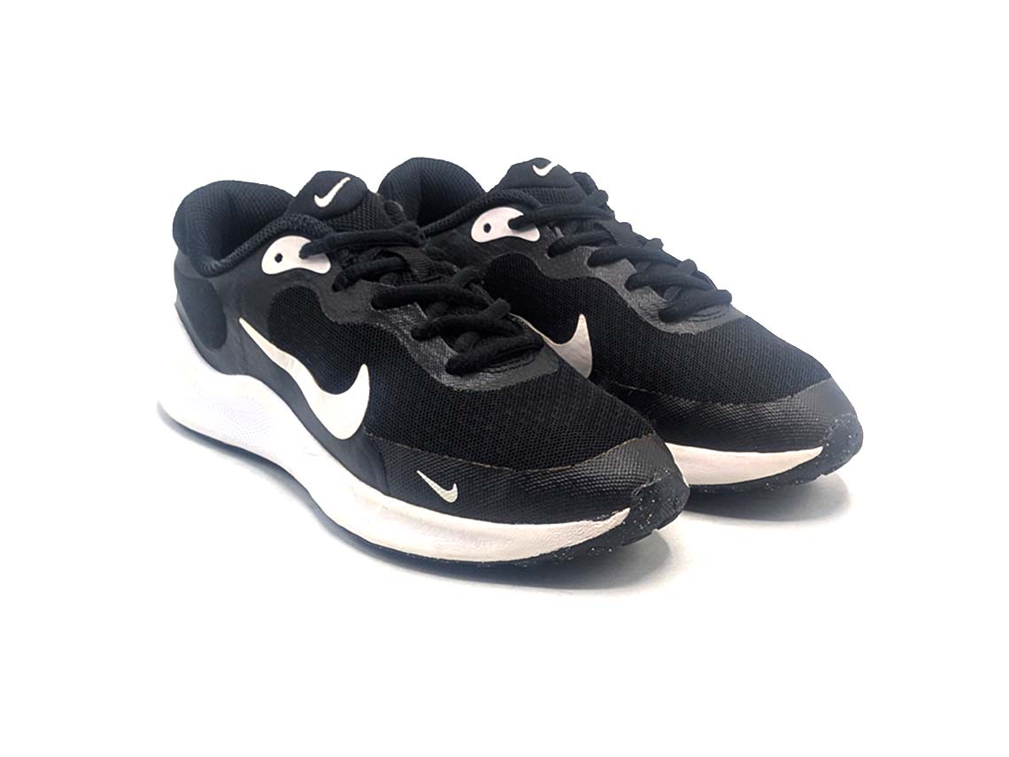 Nike Revolution 7 is a running shoe designed for men, women, and kids. It features a lightweight mesh upper for breathability and comfort, with synthetic overlays for support. The foam midsole and rubber outsole provide cushioning and traction for a smooth ride during runs or workouts. It also has a lace-up closure for a secure fit.