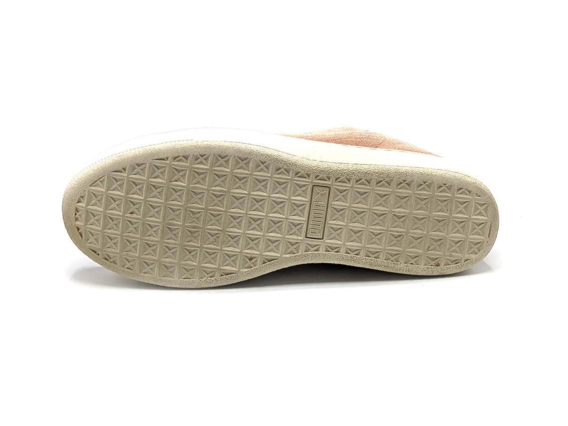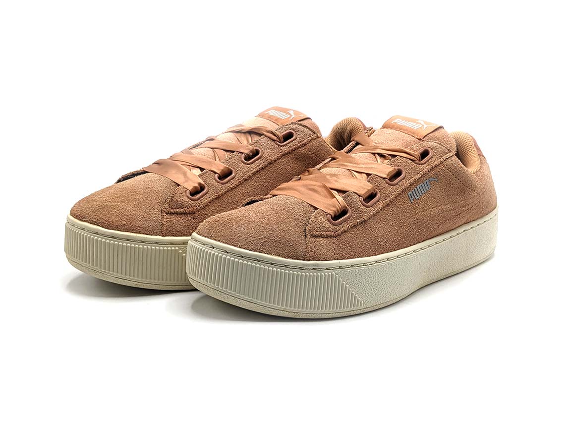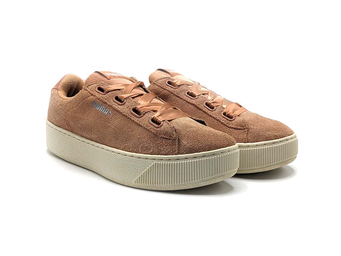 The Puma Vikky sneakers are a fashionable addition to any wardrobe. With a stylish platform sole and a classic Puma formstrip, these shoes are both trendy and functional. The soft suede upper and padded collar ensure a comfortable fit, making them perfect for all-day wear. The ribbon laces add a feminine touch to these versatile sneakers, making them perfect for dressing up or down.