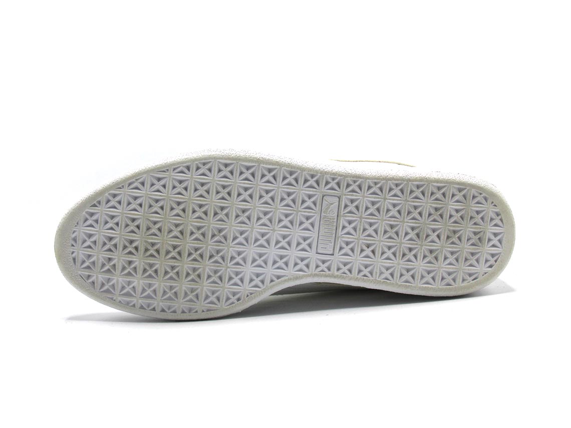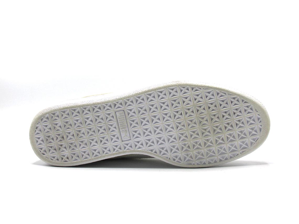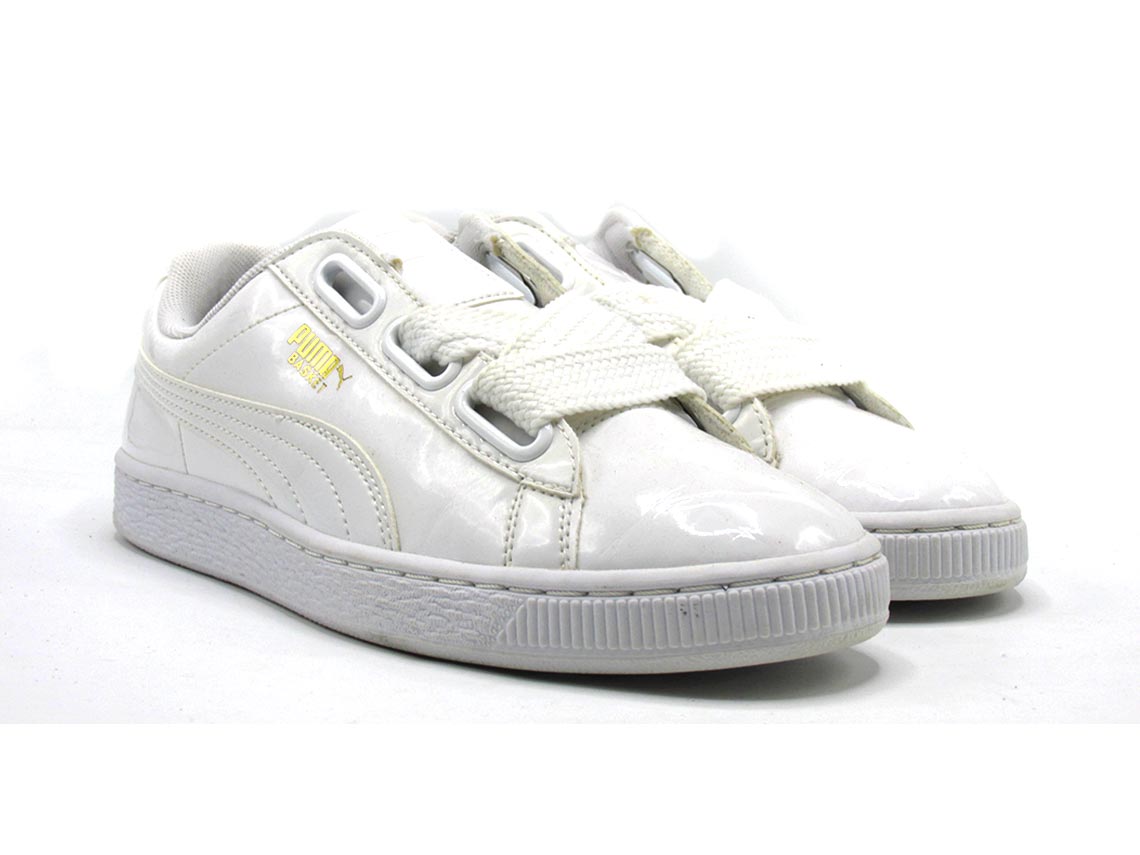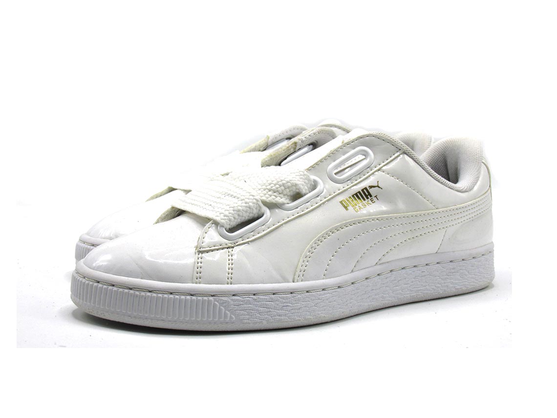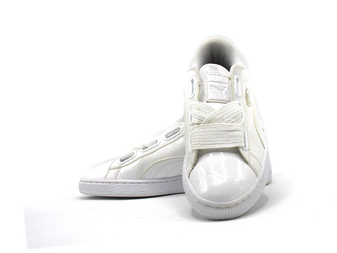 The Puma Women's Basket Heart Patent Sneakers are a modern and feminine take on the classic basketball-inspired shoe. They feature a glossy patent leather upper with oversized laces that can be styled in different ways for a customized look. The sneakers have a comfortable padded collar, a durable rubber outsole, and the iconic Puma Formstrip logo on the sides. With their stylish design and versatile appeal, these sneakers are a perfect choice for fashion-forward women.